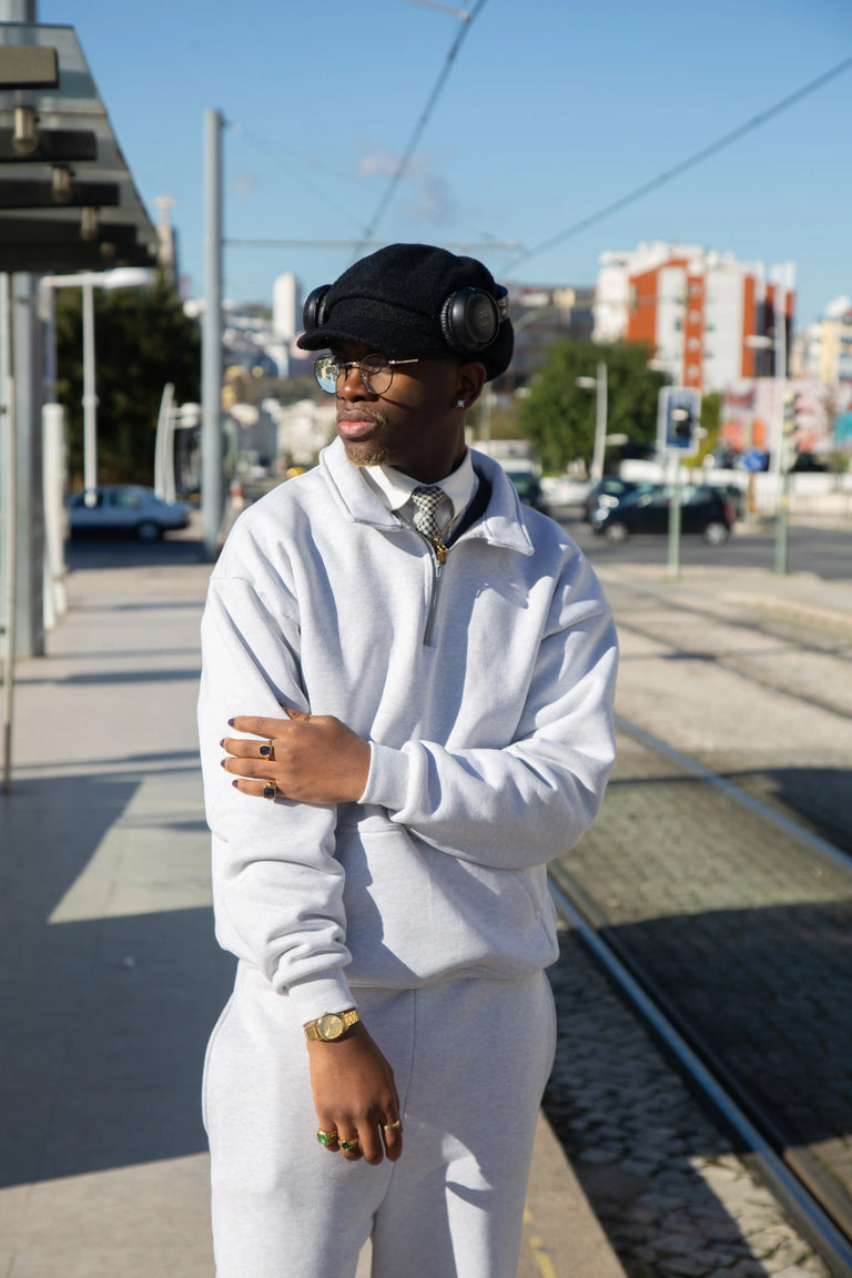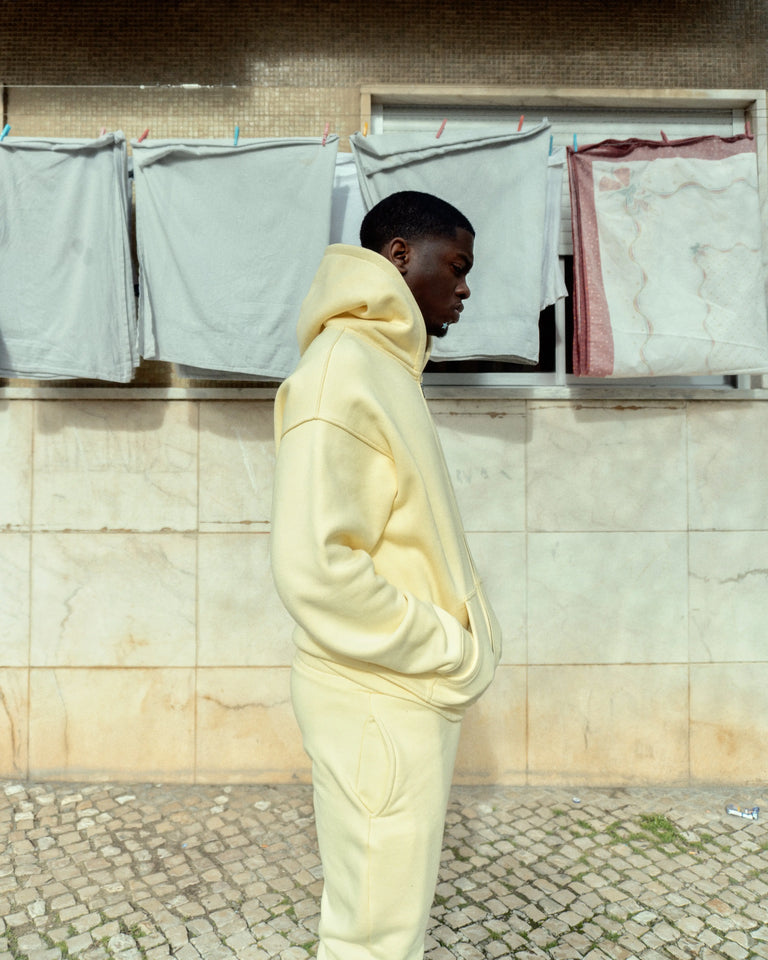 While the 450 gsm is knitted diagonally, offering a soft touch on the outer layer and a fully brushed fleece lining, the 600 gsm is woven vertically, creating a raw texture on the outside and featuring a looped french terry inner side.